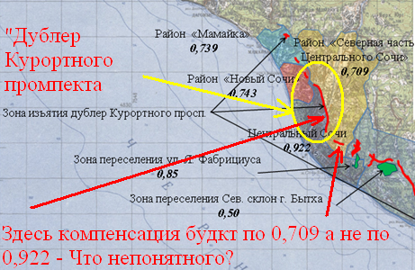 Поясняю еще раз что меня смущает. Дублер курортного проспекта (красная линия) проходит ровно по границе двух ценовых зон с коэффициентом 0,709 и 0,922, при этом полоса отчуждения вся попала на зону коэффициента 0,709. То есть жители Сочи получат значительно меньшую компенсацию чем в случае если бы она считалась по коэффициенту 0,922. Я считаю я считаю что зонирование проведено таким образом Олимпийским департаментом намеренно что бы уменьшить компенсационные выплаты жителям Сочи. Я просто хотел бы от Вас получить ответ для чего это было сделано? Понятно? Вы в состоянии ответить на конкретно заданный вопрос?