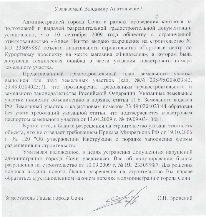 Сообщаем, что разрешение на строительство вышеуказанного объекта выдано в соответствии с требованиями градостроительного законодательства, на основании документов, предусмотренных ст. 51 Градостроительного кодекса РФ, а именно: