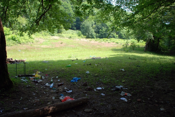 Когда спустились к слиянию Агурчика и Агуры… вначале тоже обрадовались… на левой стороне где бревно и место для костра — почти чисто… а вот на другой стороне, где полянка… разбросанный мусор.