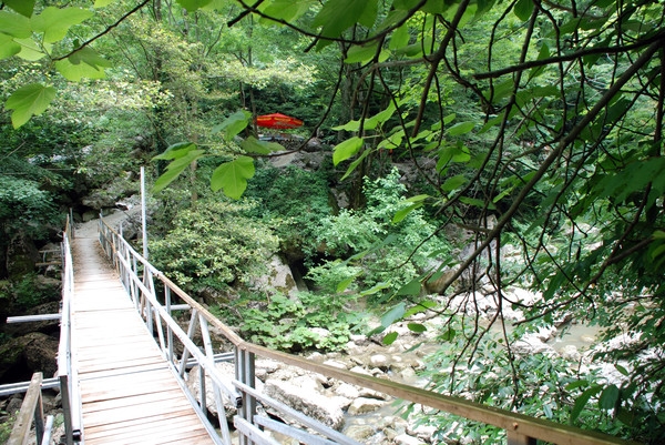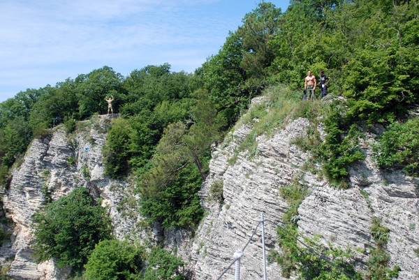 По тропе вдоль Агуры, на удивление, мусора не было вплоть до мостика… кстати! Теперь у большого водопада там ноу-хау… над водоемом натянуты две веревки… по которым можно съехать к водопаду на тарзанке… насколько это позволительно с точки зрения МЧС и прочего — не уточняли… плюс там теперь работают ребята в фирменных красных майках с надписью «Орлиные скалы»… стоит палатка… и сделан новый мост! (это плюс).