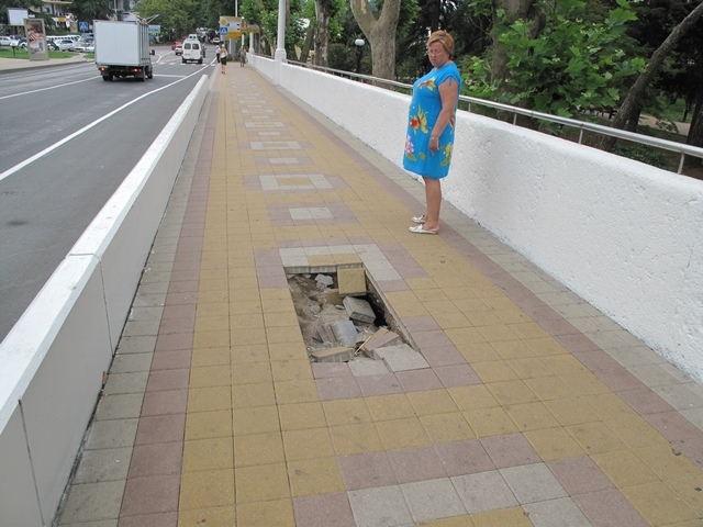 Или, может быть, за минувшую неделю пешеходная часть моста ни разу не убиралась? Или за ней не закреплено соответствующее лицо с метлой в руках, получающее за это зарплату? А если в эту яму упадет ребенок, один из тех, которые сотнями идут с родителями из центральной части города на один из немногих оставшихся бесплатными ревьерский пляж?