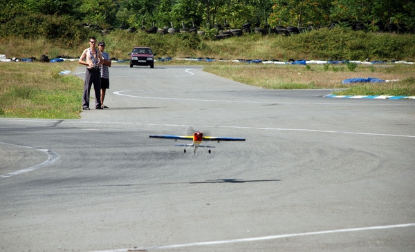 На картодроме летают и новички и ребятки посерьезнее. Парня на фото зовут Василий — недавно с соревнований в Тахтамукае первое место по 3D привез. Входной билет в авиамоделизм стоит примерно 300 баксов — простенькая аппаратура и пенопластовый самолет. На первое время за глаза хватит. Серьезные самолеты с аппаратурой и соответствующими движками стоят от 800$ до бесконечности — но это хобби, а на удовольствия денег не жалко, тем более, что комплект аппаратуры и двигатели обычно кочуют с одной модели на другую и покупаются единожды, а сами самолеты стоят совсем недорого.