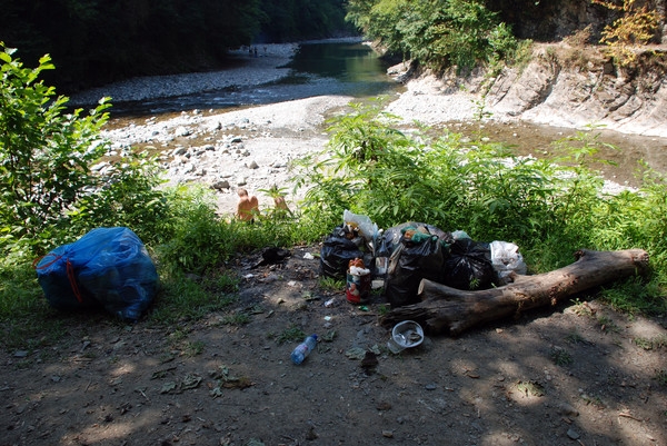 Вернулись на первую поляну… там на берегу стояло несколько палаток… народ веселится и отдыхает и по эту, и по ту сторону реки. Ребята пошли собирать основной мусор, а я полезла инспектировать склоны, заросшие кустарником и богатые на мусородобычу… что только не находили… бррр…