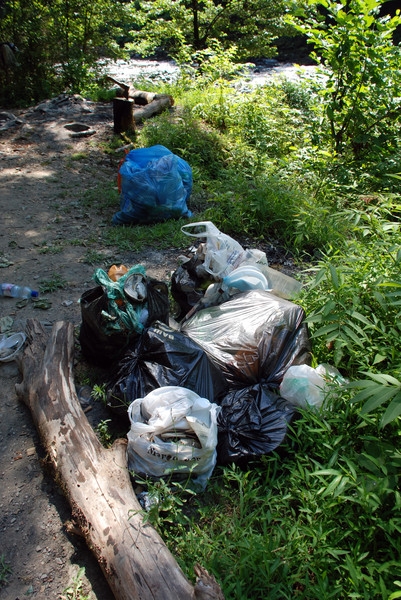 прошли по берегу в одну сторону и в другую… по округе, за мостик… по склонам… Дима и Вовка прошлись до полянки наверху и вернулись с двумя полными пакетами. В итоге здесь мы собрали 6 больших пакетов.