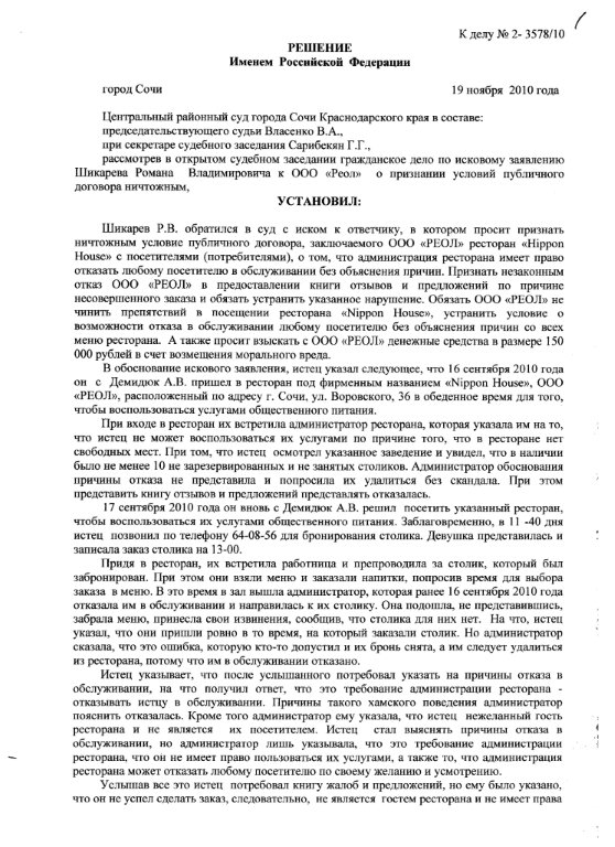Самое удивительное, адвокат ответчика предствил указанную статью в распечатанном виде и указал на то, что якобы это мой вид заработка — обижать бедные рестораны. Все ходатайства ответчика были отклонены, так как не имели для дела никакого значения. Адвокат ответчика смотрелся конечно очень вяло, даже сказать как-то призрачно. Но может это все и была просто игра. Суд, вошев в зал, еле шевеля губами обхявил решение, будто сам боялся того, что его кто-то услышит.