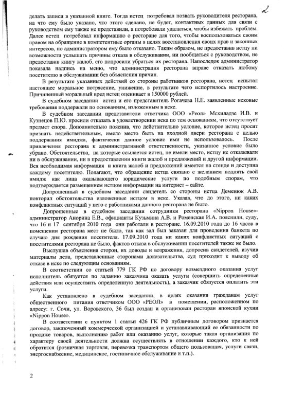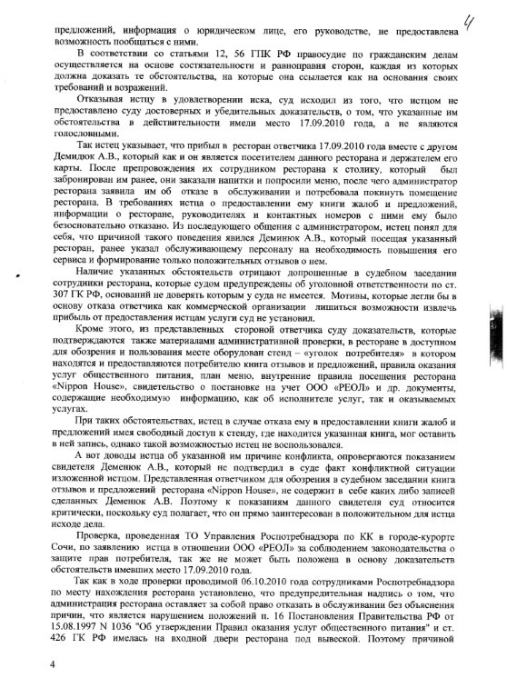 истец и его представитель обосновали свою позицию кратко, лаконично и по существу, указав на все нарушения ответчика. Ответчик признал, что надпись была и там, и тут, но не смог пояснить, зачем она им нужна, если ответчики ее якобы не использзовали никогда и никому не отказывали. Свидетель истца подтвердил все факты по сути иска, рассказал кк и что происходило. Свидетели ответчика не смогли пояснить суду ничего. Даже та самая администратор не смогла толком ничего сказать, так как память у нее увы… и ах. Было видно, что руководство ресторана дало установку говорить по одному сценарию. Не был приглашен официант, который нас обслуживал, не пришел и управляющий. Директор ресторана вообще не смог ничего сказать, просто сидел и пожимал плечами. И несмотря н то, что были представлены данные о привлечении ответчика к ответственности, несмотря на показания свидетеля суд счел, что истец не доказал ни одного обстоятельства.