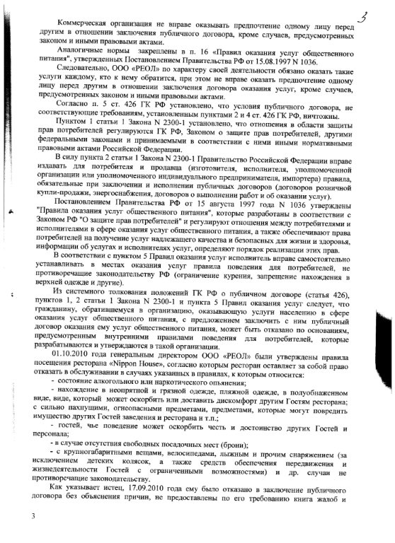 Истец: Да, уважаемый суд. Прошу приобщить к материалам дела последнюю страницу меню ресторана Ниппон Хаус, где и указана возможность отказа любому гражданину в обслуживании, о чем я и указал в иске. Ответчик немного не ожидал такого поворота событий и лажде не попросил копию для него.