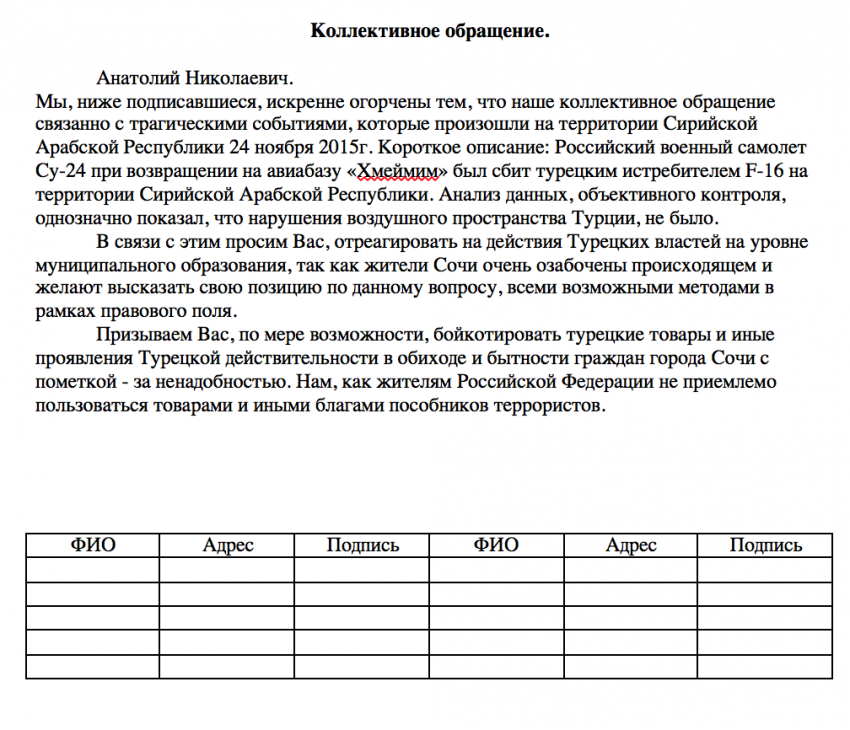 Я написал коллективное письмо от жителей города Сочи — главе муниципального образования города-курорта Сочи Пахомову А.Н.