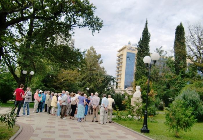 А это иностранные туристы, любуются природой Сочи, гостиницей «Приморская», памятником Пушкина на Приморской набережной.