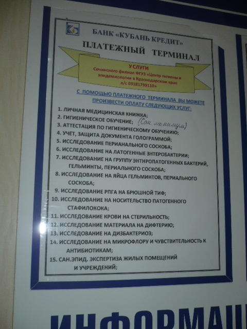 В начале той недели у меня возникла необходимость продлить действие уже существующей санитарной книжки и я, предположив, что это делается без особых проблем пошла на ул. Роз 27, где расположен Сочинский филиал Федерального Государственного Управления Здравоохранения " Центр гигиены и санэпидемиологии". Наивно полагая, что поскольку у меня книжка на руках, я по быстрому пройду необходимые процедуры и все. Не тут-то было… Все началось с нововведений по оплате данных услуг. Для того чтобы сейчас получить санитарную книжку впервые, нужно потратить от 2500-3500 рублей, для повторных — 1500-2000рублей, при этом ВСЕ оплаты идут только через терминал коммерческого банка:
