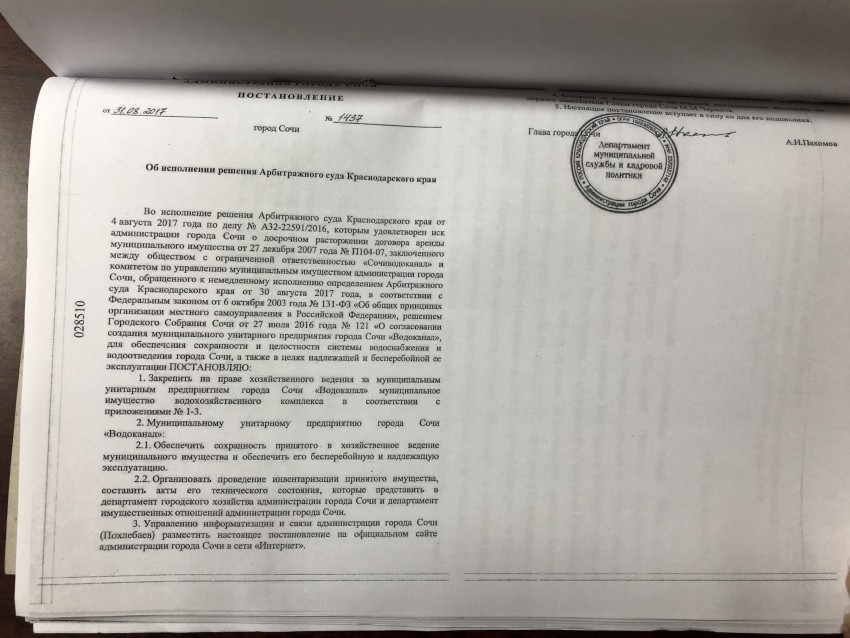 Кто у нас арендодатель — правильно снова администрация города Сочи, ну тогда извините как возник весь этот беспредел без ее участия. Есть еще ряд Законов которые прямо говорят о технической документации, которой должно обладать предприятия осуществляющее водоснабжение и водоотведение. Без них оно функционировать не должно. Ну и что слуги народа обеспечили передачу документации — нет