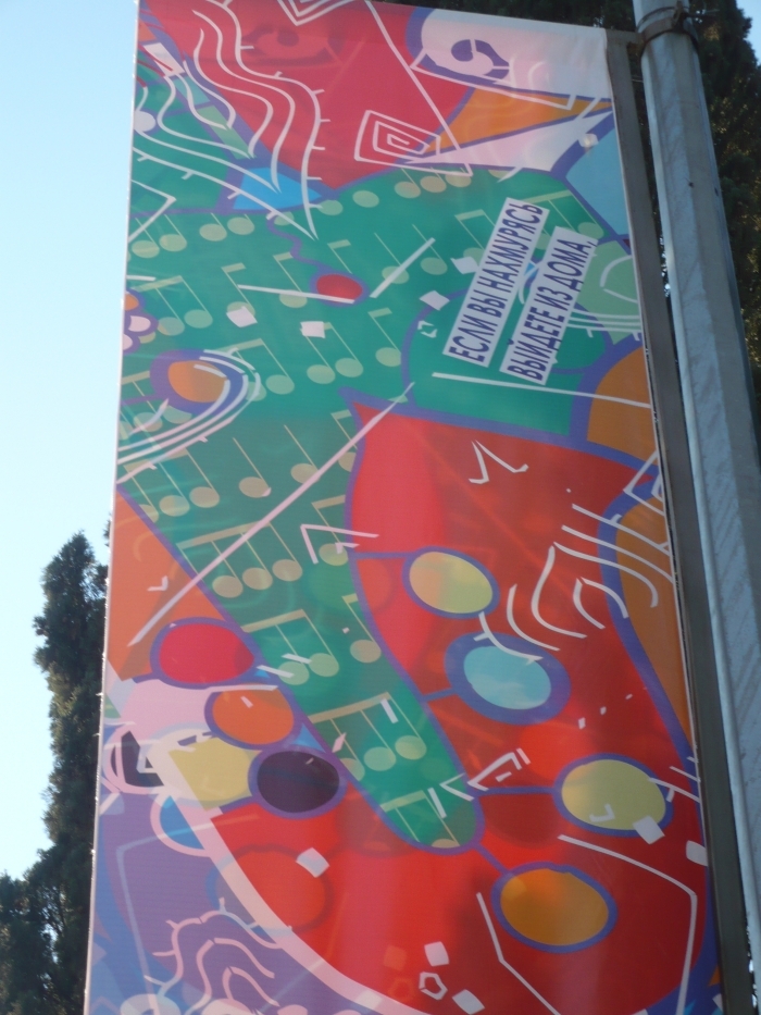 Присутствовал в администрации и мне лично Баранская объясняла что это, а это «яркие цветовые пятна, и нужны они для того, чтоб город выглядел ярче, т.к. в межсезонье городу не хватает цвета» и т.п. «Прочитав строчку и песни, у вас поднимется настроение»… Еще долго говорила и показывала примеры оформления торговых точек в этом стиле.