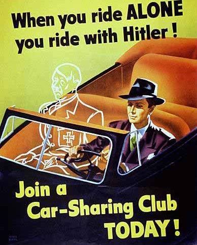 Плакат военных лет. Написано: «Если ездишь один — катаешь Гитлера. Вступай в клуб, расшарь свою тачку»