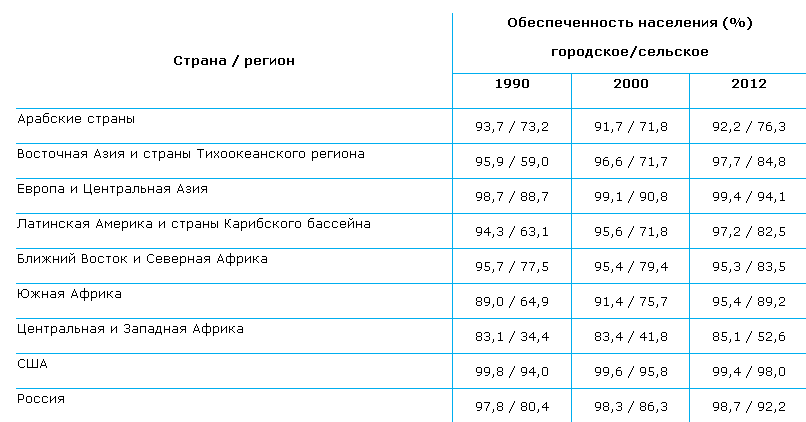 Даже на 2012 год разве плохой результат городского обеспечения на 98,7 и сельского на 92,2 % разве плохой результат для огромадной страны с длинющими расстояниями между городами и селами, часть из которых находится в супер экстремальных климаических условиях.