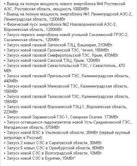 В России ожидается ввод или уже введены следующих объектов энергогенерации