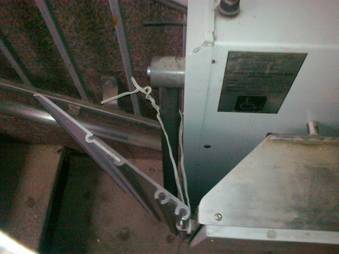 С левой стороны находится электроподьемник для инвалидов-колясочников. Наверняка весьма недешевое оборудование, купленное как водится на бюджетные деньги. Казалось бы вот оно — доступность! Инвалиды благодарят государство за много раз обещанную заботу! НО — если глянуть ближе картина меняется очень быстро.