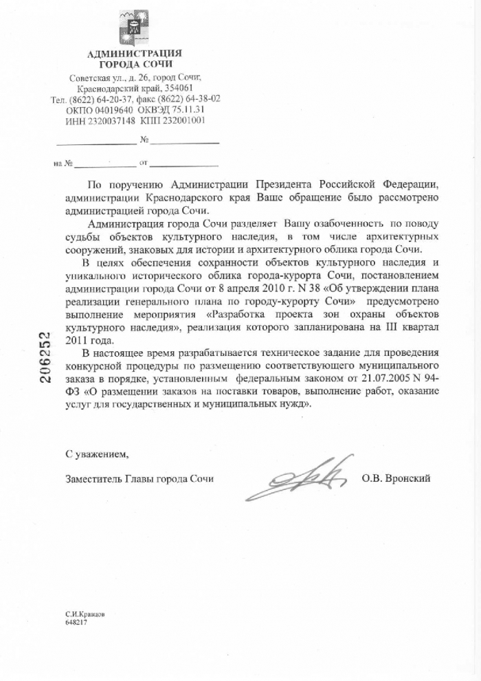 Свое письмо я отправила 2 марта. 4 марта мне пришло извещение, что оно получено. 21 марта пришло извещение из администрации Краснодарского края, что обращение, направленное из Администрации Президента получено, и перенаправлено в Управление по охране, реставрации и эксплуатации историко-архитектурных ценностей (наследия) Краснодарского края. Интересно, что документ датируется 15 марта. В итоге, 13 апреля мне пришло письмо из этого управления.
