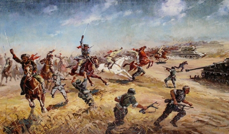 02.08.42 В районе Кущевской казаки 13 кд (2 сабельных полка, 1 артдивизион) предприняли невиданную атаку в конном строю протяженностью до 2,5 километров по фронту на 101-ю пехотную дивизию «Зеленая роза», два полка СС,, 5-я и 9-я румынские кавалерийские дивизии (всего артиллерии: 12 пушечных и 15 минометных батарей).