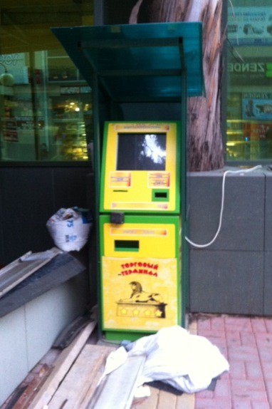 Там где виадук (мост через дорогу), переходить дорогу не надо, подниметесь по лестнице на Голубые Дали и сразу увидите магазинчик «Мария» и этот автомат.