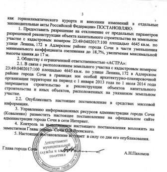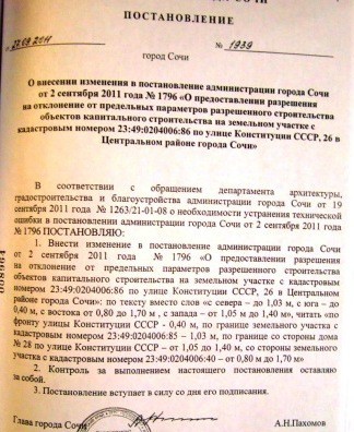 Стоит вспомнить большое количество постановлений за его подписью, разрешающих застройщикам увеличить параметры (высоту, площадь застройки) «разрешенного строительства» и уменьшить отступы до 0.00 м. от «фронта дороги», уменьшить процент озеленение практически до 0% по объектам на улицах: Первомайская,1; Конституция СССР, 26; Красноармейская, 30; Московская, 22; Навагинская и на многие другие объекты по иным улицам!