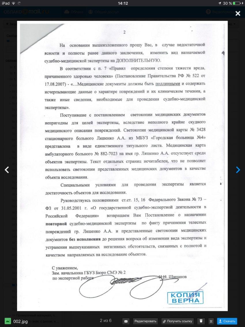 Ну и причина, по которой я вынуждена писать опять, это то, что каждый день мне что то обещают, но к сожалению ни чего не делают. Думаю умышленно заказали экспертизу, в «неправильной» форме, с подготовленными фальшивыми «мед документами», но не рассчитывали, что зам начальника СМЭ N 2, Шипанов И. откажется делать по фальшивкам.