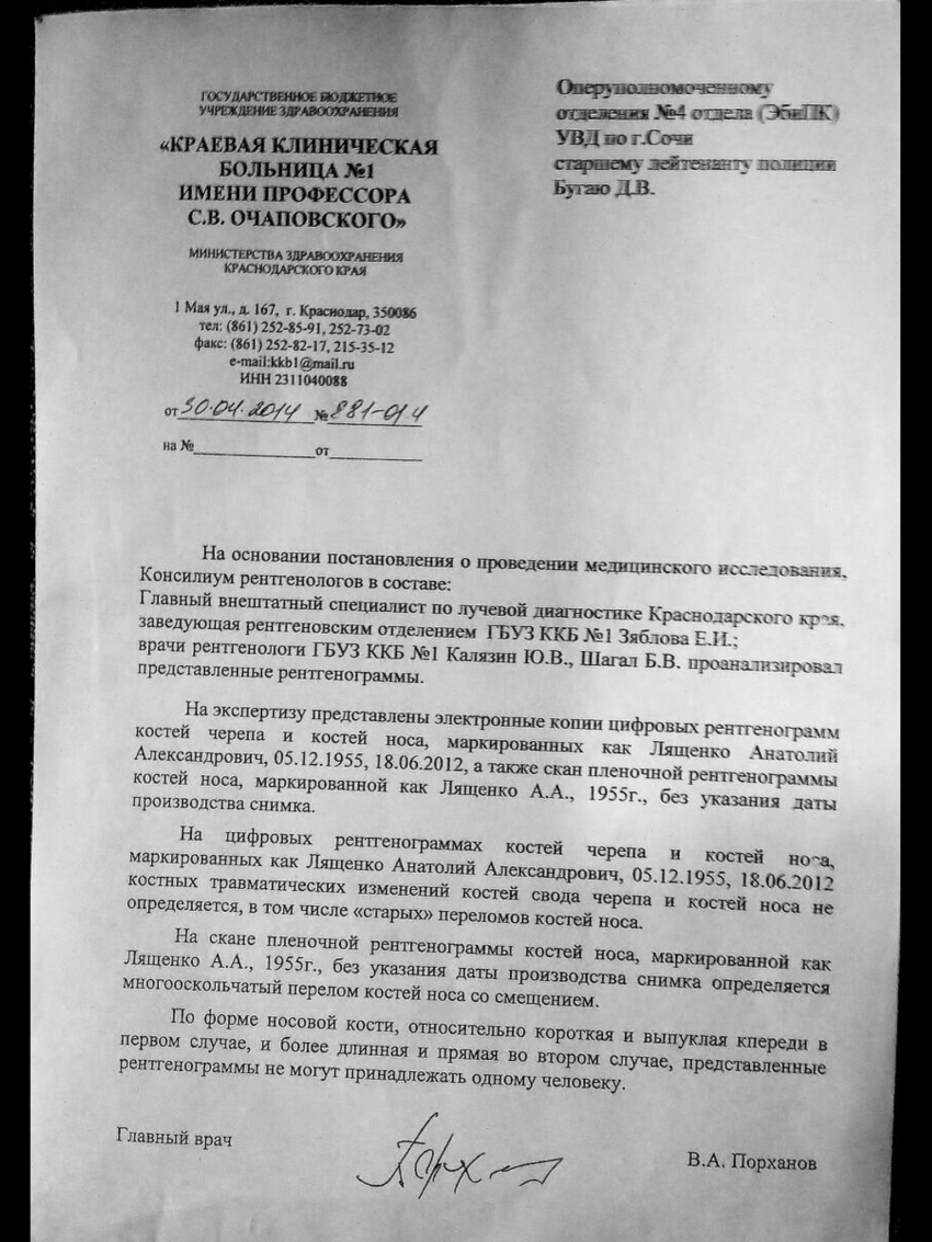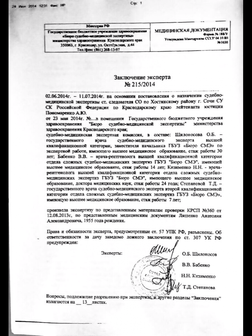 Финаров сделал описание только по жалобам Ляшенко, без единого мед док, для Экспертизы Шипанову, то есть, якобы определял степень тяжести вреда здоровью, то есть степень «продуваемости носа»… бред… не ВК, а Финаров в единственном лице, дал бумагу, называющуюся «консультативное заключение», именно для Шипанова, понимая степень ответственности… для СМЭ, что было указано в запросе Шипанова, в его назначении, позже выставлю документ.
