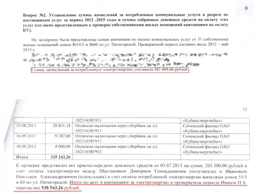 «Да» — отвечали мы, — «Мы знали и не сидели сложа руки, мы ведь знаем откуда образовался этот долг». Ведь бывший управляющий домов на Пятигорской 54/5 и 60 (Иванов Николай Александрович, глава соболевки, будущий депутат, опора страны), на которого в июле 2015 года было написано заявление в полицию, не донес до энергосбыта 614 969 рублей, что показала независимая экспертиза, которая проводилась по документам, изъятым ОБЭП у фирмы Иванова. Разбирательство идет уже год, ОБЭП подтверждает признаки мошенничества по нескольким статьям, но следственный комитет почему то не торопится с этим делом. А также возникает множество вопросов к бывшей управляющей домами на Молодогвардейской 2Б/2 и соответственно текущей управляющей дома 2Б/3 Гаврилиной Елене, расчеты которой по электроэнергии также оставляют в душе сомнения.