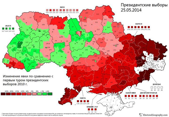 Люди не пришли голосовать, потому что голосовать было не за кого (+ где участки не работали). Пришедшие были при ложном ( отсутствие ) выборе. Голосовали за менее бандерложестого кандидата ( Добкин и Тигипко из ненавистной ПР) Порошенко выбрала Центральная и Западная Украина.