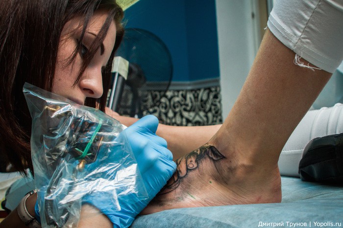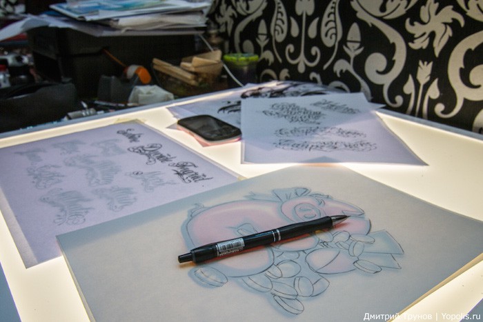 «Как-то, рассказал один из мастеров, — пришла девочка – хотела себе на всю грудь надпись „Imagination“, мы ее убедили, что на столь деликатном месте нужно делать что-то красивое. Сейчас я ей делаю с одной стороны енота, с другой стороны — лису. Девочке 18 лет, а начала с груди — вот это я понимаю, первая татуировка! Молодец! Из популярных татуировок на первое место сейчас выходят герои мультфильмов, а у наших новичков — надписи!»