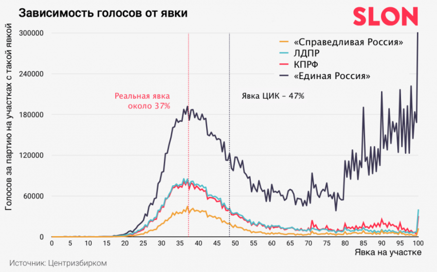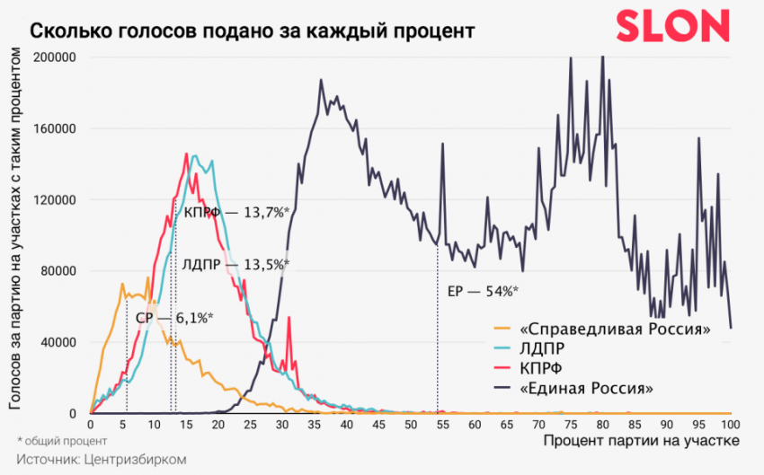 Накидать в урну пачку бюллетеней – это самый простой способ изменить результаты голосования в поддержку того или иного кандидата или партии, поясняет он. При этом неминуемо растет явка: чем больше добавляешь бюллетеней, тем больше она растет. Именно на таких участках получается очень большое число голосов за одного кандидата и немного — за его оппонентов. Если бы вбросов не было, а явка бы поднялась до максимальной по естественным причинам, распределение голосов, согласно «кривой Гаусса», показало бы пропорциональный рост. В данном же случае рост был только за «Единую Россию».