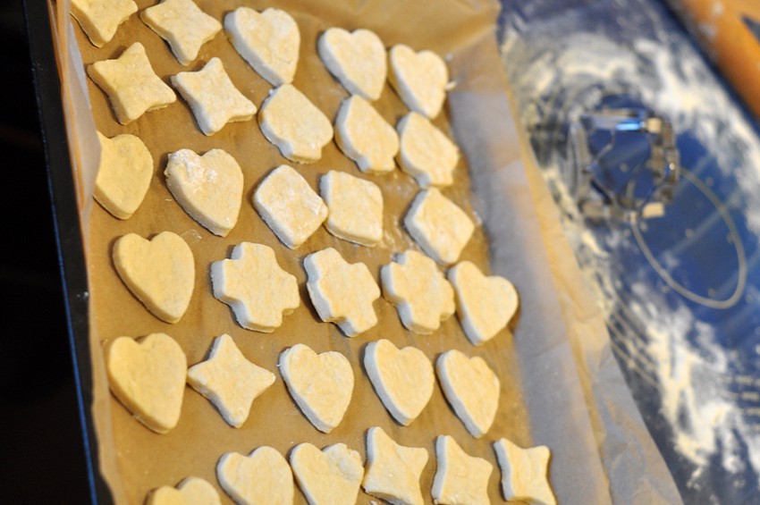 Вырезала, уложила на противень и отправила в духовку на 15 минут. Потом, когда тесто немного поднялось — достала противень и на каждую печенюшку посыпала тертого сыра и обратно минут на 5-10.