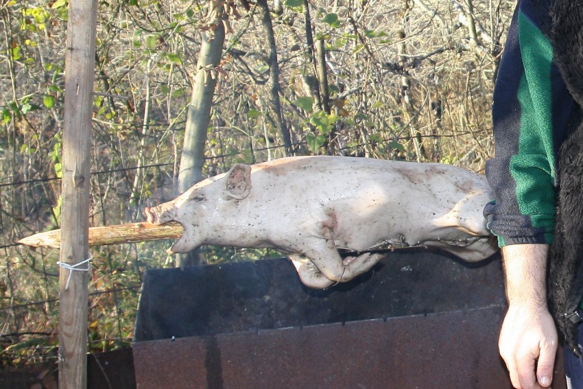 И вот наступило 31-е число, 4-ре часа вечера, время жарить поросенка. Накануне был подготовлен вертел, который мы сделали из орешника, оборудовали мангал для жарки поросенка, чтобы можно было менять высоту.