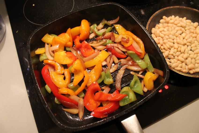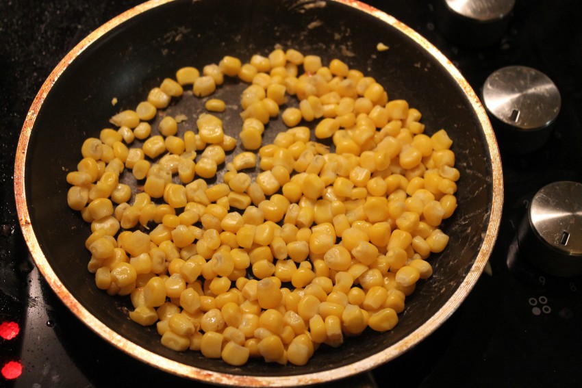 Перцы с луком жарим на сильном огне. фасоль и кукурузу просто разогреваем.