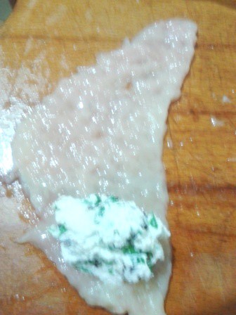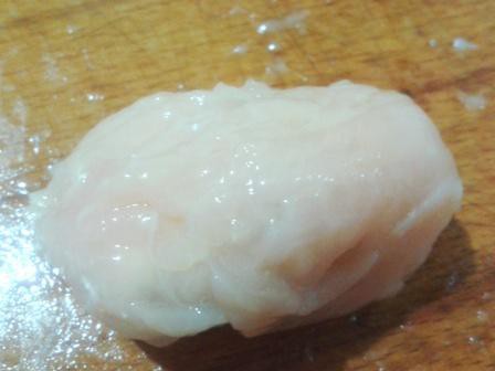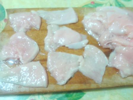 Разделить грудку, отбить филе (хорошенечко). Посолить, поперчить.