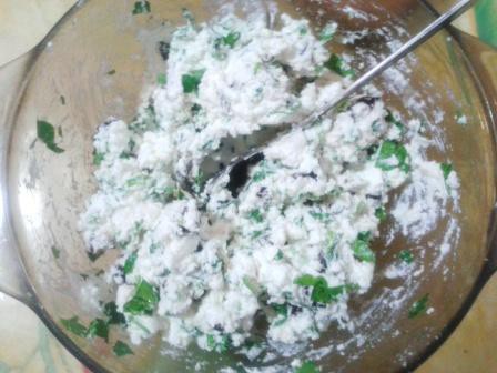 Готовим начинку для рулетиков: смешиваем творог, петрушку и чернослив. Чернослив предварительно можно залить кипятком минут на 10, затем мелко порезать.