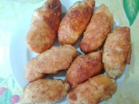 Рулетики обмакнуть сначала в яйце, потом в сухарях, обжариваем с двух сторон до румяности.