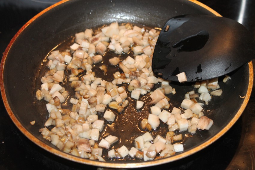 берем 10 шампиньонов отделяем от ножек их режем их и на сковородку-жарим