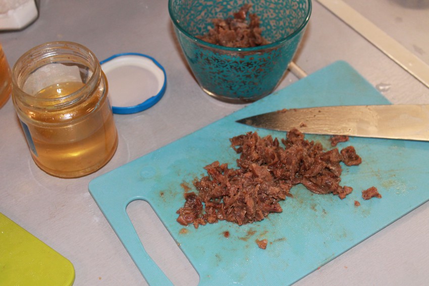 3.Рубим мелко анчоусы сохраняем рассол (можно взять кильку-реально дешевле. Баночка 200 гр анчоусов вышла по-моему 250 рэ. )