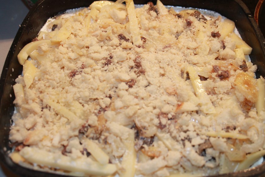 посыпаю хлебными крошками.выливаем рассол из банки заливаю 500 мл сливок (жирность выберите сами)