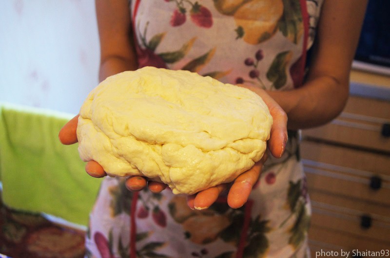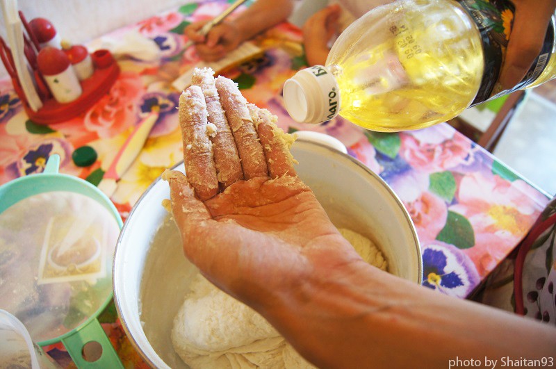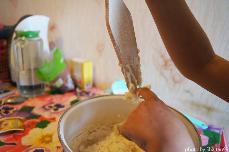 Отправьте помощницу смотреть мультики, смажьте руки растительным маслом и доведите его (тесто) до кондиции уже вручную
