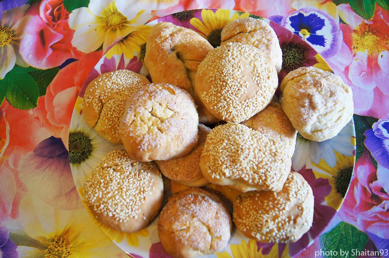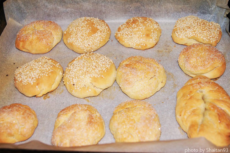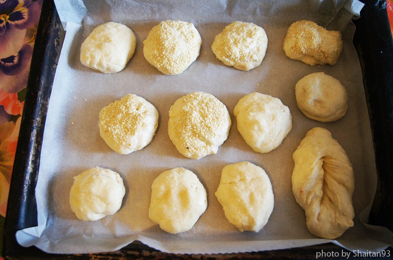 Формирование булочек. Тут каждый волен делать что захочет. Формы, размеры, замысловатость фигур и прочие кренделя — все согласно воображению повара. В данном случае торопились, поэтому отделались простыми «плюхами», часть которых посыпали сахаром, другую часть кунжутом.