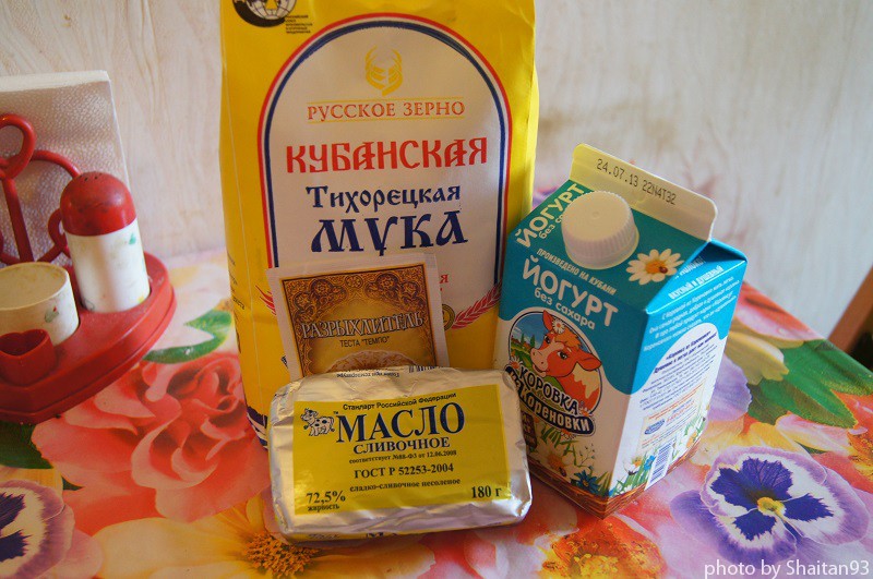 Йогурт смешать с растопленным сливочным маслом (примерно 100 грамм), добавить разрыхлитель, соль, сахар (столовая ложка). Соль, сахар, разрыхлитель и муку добавлять постепенно в процессе смешивания