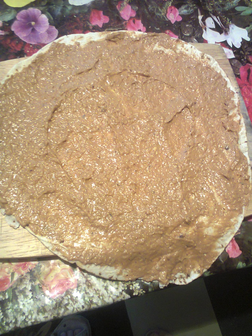 Нанесем смесь слоем на лаваш и свернем его тугим рулетом.