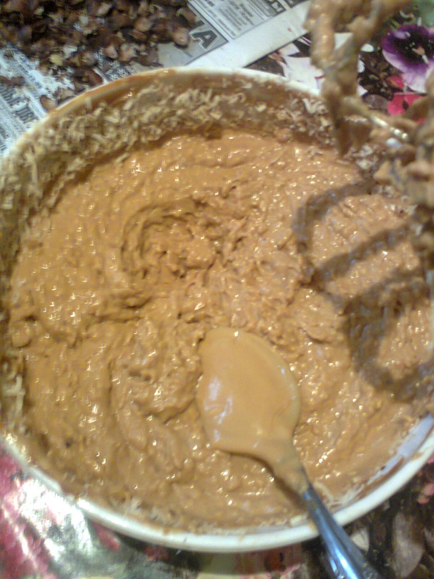 Орехи можно измельчить скалкой. Смешаем вместе орехи, сгущенку и масло. Я взбивала миксером.