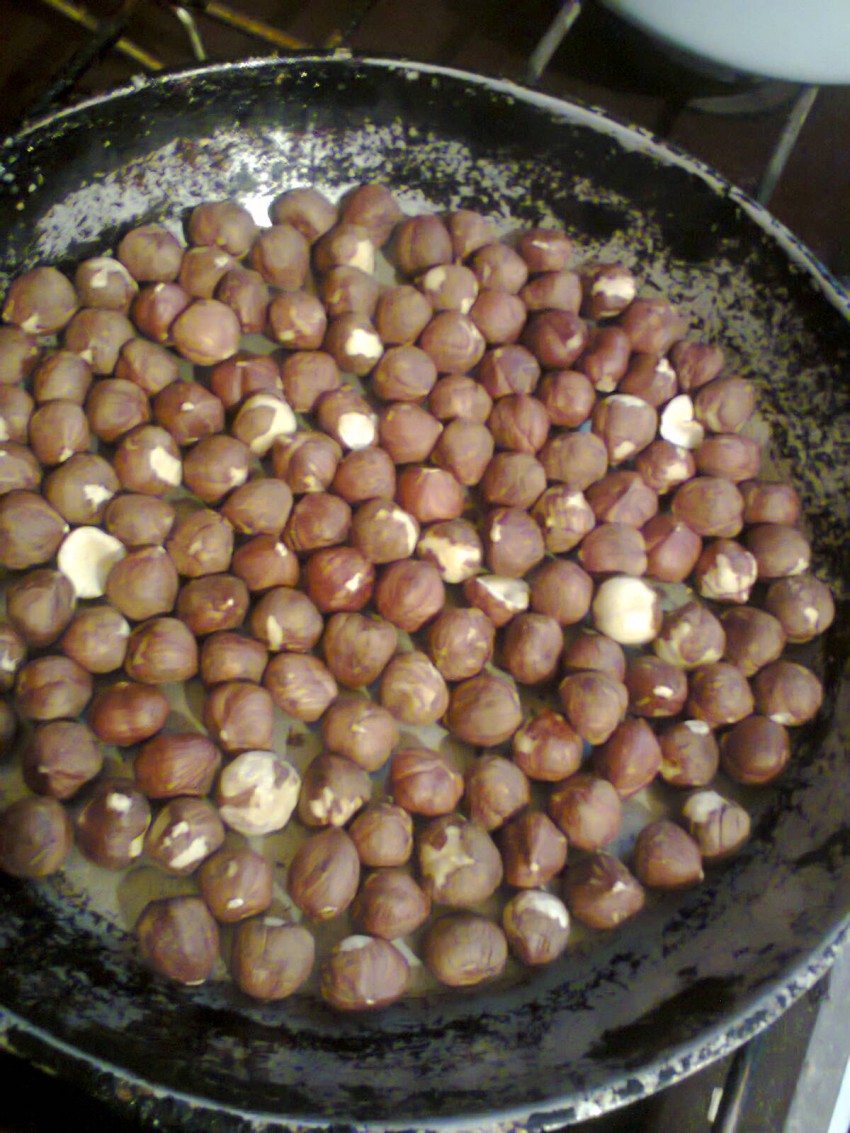 ● 1 стакан чищенных грецких орехов.- это идет в оригинале рецепта, у меня был фундук, который я обжарила на сухой сковороде, очистила от шелухи и натерла на мелкой терке