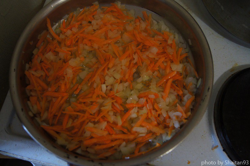 Начал с подготовки начинки. Для начала поставил на плиту вариться рис. Сколько риса было в граммах сказать не могу, так как при готовке больше доверяю вкусовым ощущения и «седьмому чувству», нежели точным пропорциям :-) Вобщем сухого риса мне понадобилось полтора граненых стакана. Довел его до состояния полуготовности и добавил в фарш. Пока рис варился, так же подготовил одну из составляющих начинки — лук и морковь (слегка припустил их на растительном масле). Так же в начинку отправились чеснок, специи и пучок кинзы (а она сейчас осенняя, ароматная такая… сочная...)