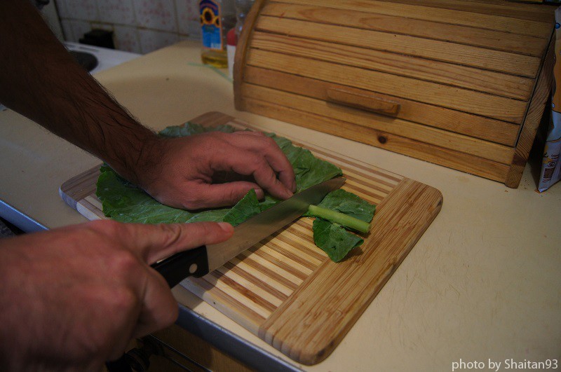 Вобщем пока фарш отставил в сторону, чтобы он, подлец, задумался о жизни нашей бренной. А тем временем приступил к подготовке листьев. Так как это не виноград, и тем более, не молодой, пришлось их для размягчения погрузить на пару минут в кипящую воду, предварительно отрезав довольно жесткое основание