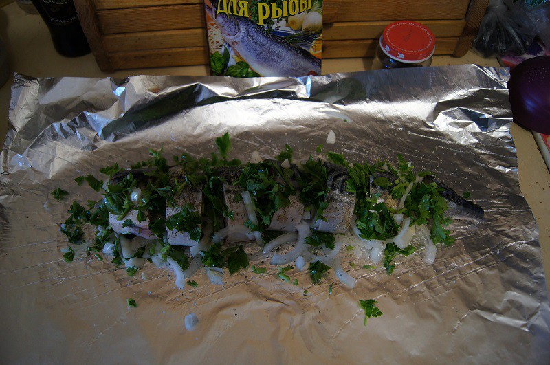 2.Положить чистую, целые филе части рыбы на ткань, посолить, немного сахара, перец и всего несколько капель лимона.