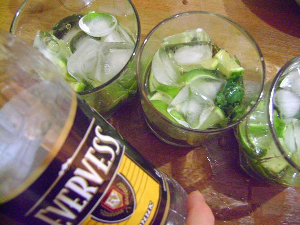 Белый ром (нам нравится «Бакарди»), швепс (обычно загодя выпускаю пузырьки — ни к чему они там), лаймы (примерно шесть штук на всю вечеринку):), тростниковый сахар (из расчёта 2 чайные ложечки на порцию), мята и обязательно лёд.