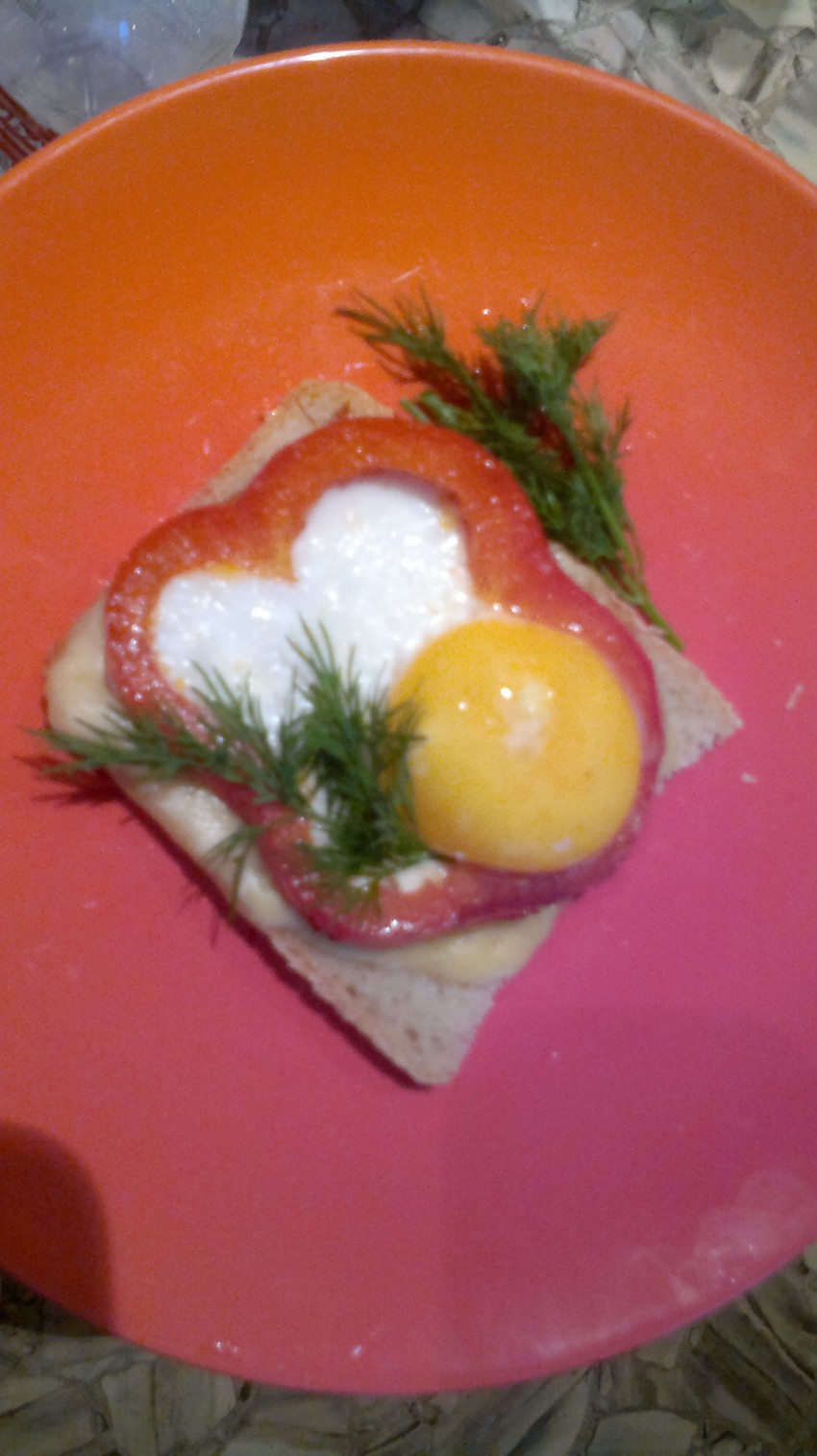 Вкусный и быстро приготовленный завтрак. Понадобится большой болгарский перец, яйца, хлеб, сыр. Приготовление занимает мин 15. Перец режем на 2 кольца, высотой в 2 см. Обжариваем немножко с 2х сторон, в перец разбиваем яйцо, и доводим до готовности. В это время режем хлеб, сверху кладем ломтик сыра, готовый перец с яйцом на хлеб с сыром. Завтрак готов! Приятного аппетита!